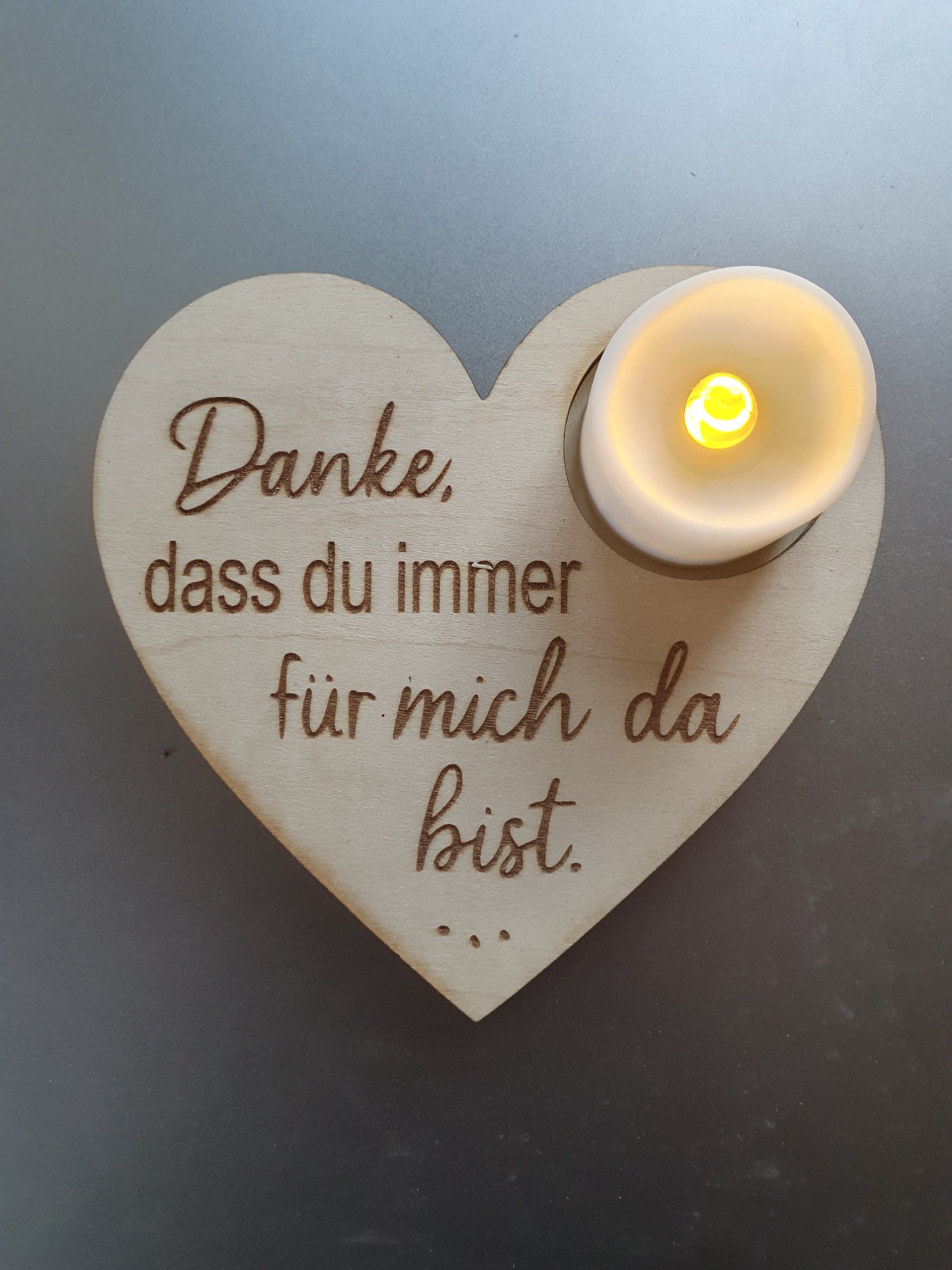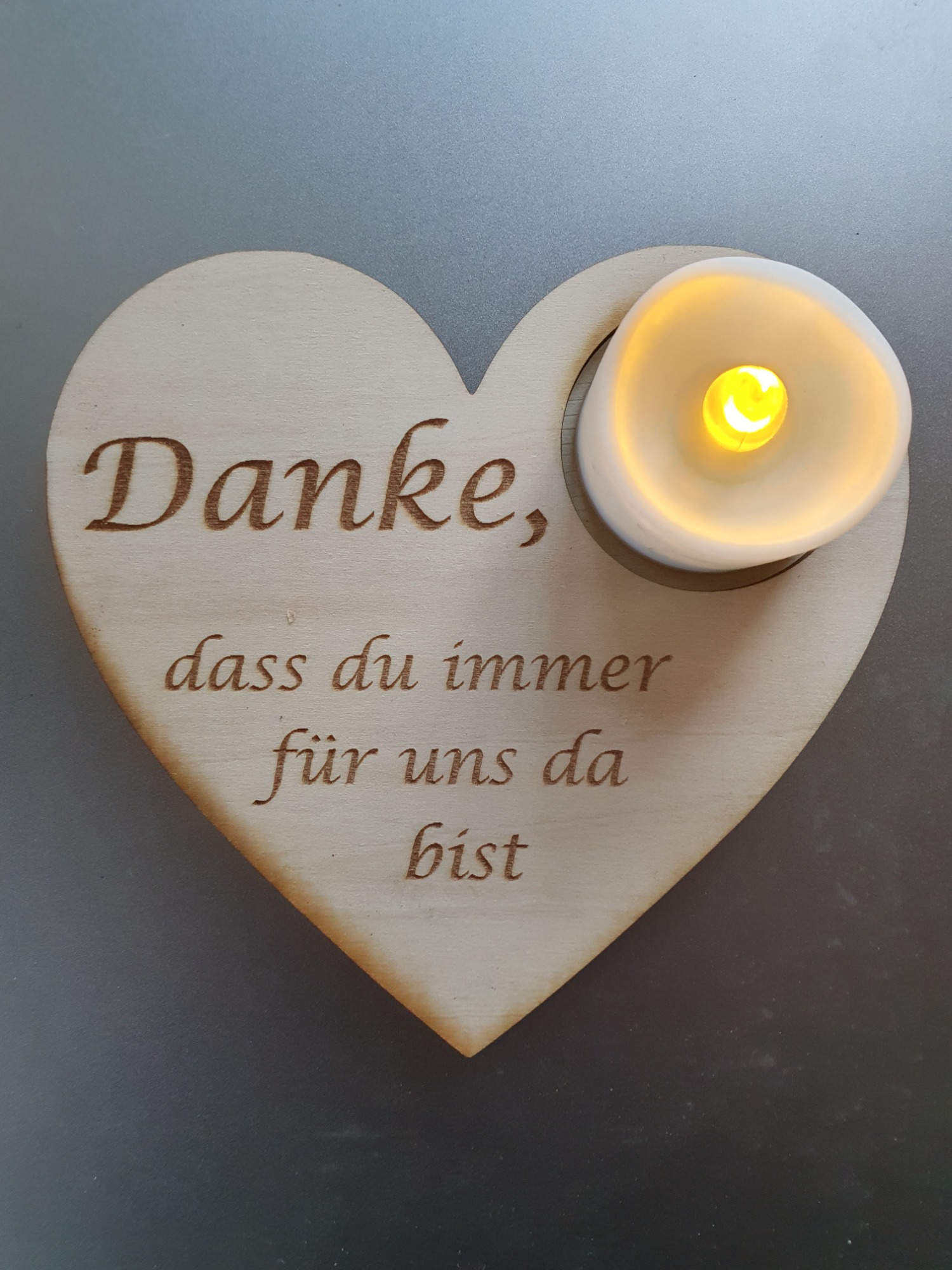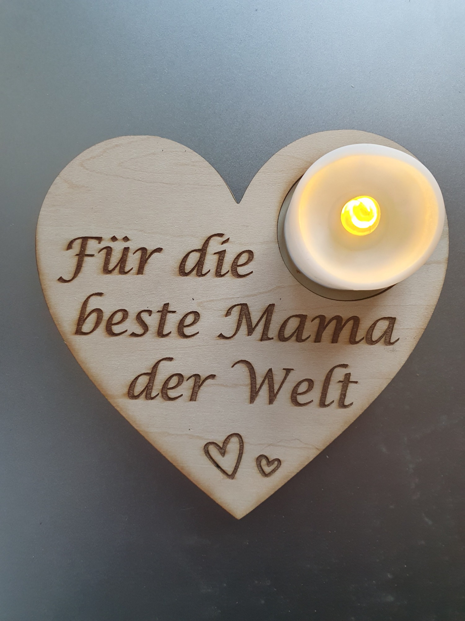 Diese liebevoll gefertigten LED-Herzen aus Holz sind ein ganz besonderes Geschenk zum Muttertag. Die warm leuchtende Kerze sorgt für eine gemütliche Atmosphäre und unterstreicht die persönliche Gravur mit individuellenBotschaften. Jedes Herz wird mit viel Sorgfalt hergestellt und kann nach Wunsch gestaltet werden. So entsteht ein einzigartiges Erinnerungsstück, das von Herzen kommt.