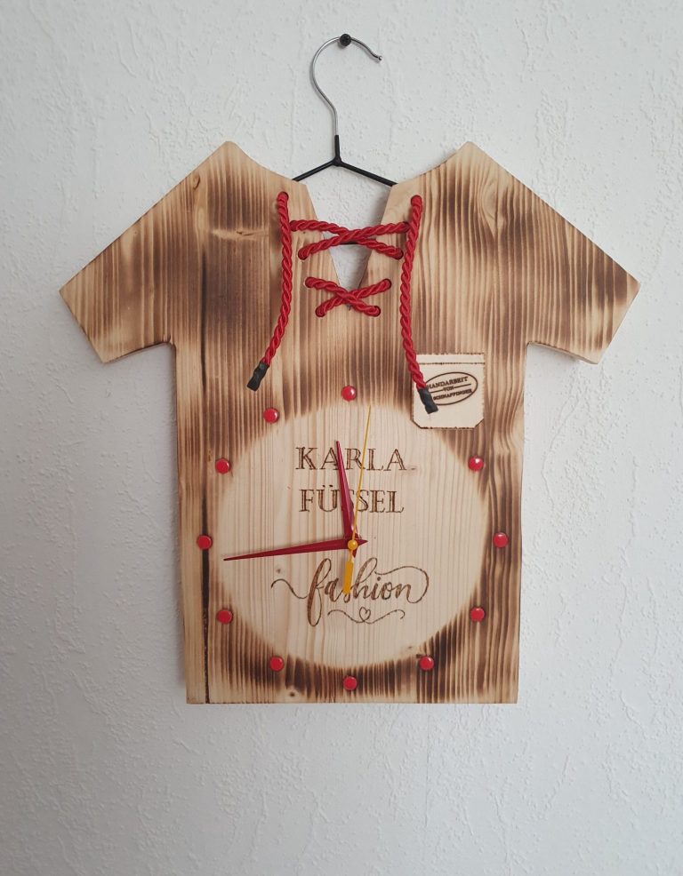 Diese außergewöhnliche Wanduhr aus Fichtenholz ist in einem stilvollen Hemddesign gefertigt und ein echtes Highlight für Schneider oder Schneiderinnen. Das 28 cm große Zifferblatt fügt sich harmonisch in das geflammte Holz ein und verleiht der Uhr eine warme, rustikale Optik. Eine rote Kordel im Halsbereich setzt einen besonderen Akzent und unterstreicht das kreative Design. Wahlweise ist die Uhr mit einem präzisen Quarz- oder Funkuhrwerk erhältlich.