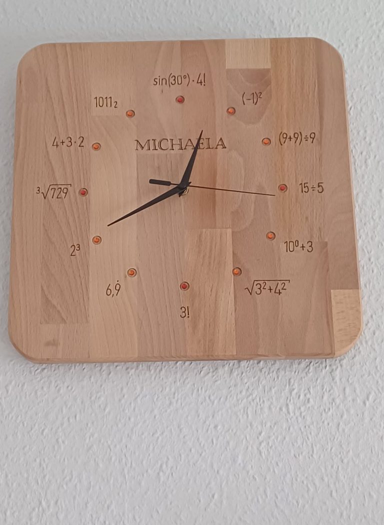 Diese Mathe-Wanduhr aus Buchen- oder Eichenholz ist ein echter Hingucker. Das Zifferblatt hat einen Durchmesser von 28 cm.